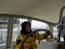 With harness and tether and boat hook I went to the mast, while Rich manned the helm and tried to turn us into the wind so we could take down the sail. The 3 meter swells did not help nor the blast of cold water that hit my face. we finally managed to pull the sail down enough so I could lash the free parts to the mast and put tension on the halyard to keep it from slapping the mast. All the while Rich and I are trying to communicate what next.